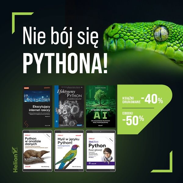 |  Nie bój się Pythona! To najbardziej przystępny i uniwersalny język programowania, który otwiera drzwi do wielu ścieżek kariery w IT 🐍🎃 Dlaczego warto go poznać? 💻 Prostota i czytelność kodu – idealny wybór dla początkujących programistów. 📈 Wszechstronność – Python jest używany w analizie danych, automatyzacji, tworzeniu aplikacji webowych, uczeniu maszynowym i sztucznej inteligencji. ⚙️ Ogromna społeczność i zasoby – tysiące bibliotek i projektów open source, które przyspieszają naukę i rozwój. 🚀 Wysokie zapotrzebowanie na rynku pracy – znajomość Pythona to atut w niemal każdym obszarze IT. Z poniższymi książkami nauka Pythona przebiega krok po kroku - od podstaw po zaawansowane projekty. Sprawdź 👇 Wkrótce VI wydanie bestsellerowego poradnika Marka Lutza 🐍👇  Python. Wprowadzenie. Wydanie VI Nic dziwnego, że programiści kochają Pythona: jest wszechstronny, czytelny, darmowy i działa na każdej platformie. Można się go stosunkowo szybko nauczyć ― ale jest jeden warunek: aby w pełni wykorzystać jego możliwości, trzeba zdobyć solidne podstawy, zrozumieć kilka trudniejszych koncepcji i... dużo ćwiczyć, pisząc własny kod. Ta książka stanowi kompleksowe i obszerne wprowadzenie do języka Python. Pomoże Ci opanować jego podstawy i przygotuje do praktycznego zastosowania nabytej wiedzy. To wydanie zostało zaktualizowane i rozszerzone, aby odzwierciedlić zmiany zachodzące w świecie Pythona. Pominięto omówienie nieaktualnej wersji 2.X,opisano nowe narzędzia, dodane do Pythona w wersji 3.12, a także innych jego edycji, które są dziś szeroko używane. Naukę ułatwią Ci liczne quizy, ćwiczenia, pomocne ilustracje i przykładowe fragmenty kodu. To idealne kompendium dla każdego, kto chce szybko zacząć programować w Pythonie i tworzyć wydajny kod wysokiej jakości. W książce: ✅ ogólny model składni Pythona ✅ wbudowane typy obiektów i ich przetwarzanie ✅ stosowanie funkcji i organizowanie kodu w modułach i pakietach ✅ obsługa wyjątków i inne narzędzia programistyczne ✅ zaawansowane narzędzia Pythona, między innymi dekoratory, deskryptory i metaklasy ✅ kod idiomatyczny, który działa na różnych platformach 📅 PREMIERA 13.11.2025! 📅 | Sprawdź naszą nową aplikację | | | |