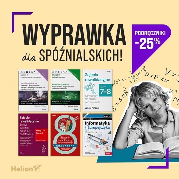 |  📚 Wyprawka dla spóźnialskich! Rok szkolny wystartował już jakiś czas temu, ale jeśli wciąż kompletujesz materiały do nauki, to nic straconego! 😉 Zajrzyj niżej 👇 Znajdziesz tam szeroki wybór podręczników dla liceów, techników i szkół średnich🎒 Jeszcze tylko dziś i jutro taniej o 25%! ✅ Informatyka, programowanie, matematyka i wiele innych przedmiotów - wszystko, czego potrzebujesz, by dobrze przygotować się do lekcji, sprawdzianów i matury. | | | | (druk) | (druk) | (druk) | (druk) | Kwalifikacja INF.03. Tworzenie i administrowanie stronami i aplikacjami internetowymi oraz bazami danych. Część 3. Programowanie aplikacji internetowych. Podręcznik do nauki zawodu technik informatyk i technik programista | Zajęcia rewalidacyjne. Zeszyt ćwiczeń dla szkoły podstawowej, klasy 1 - 3. Część 1. Doskonalimy kaligrafię, syntezę i analizę wzrokowo-słuchową oraz uczymy się o emocjach, uczuciach i zachowaniach | Kwalifikacja INF.02. Administracja i eksploatacja systemów komputerowych, urządzeń peryferyjnych i lokalnych sieci komputerowych. Część 1. Systemy komputerowe. Podręcznik do nauki zawodu technik informatyk | Zajęcia rewalidacyjne. Karty pracy dla szkoły podstawowej, klasy 4-6 | Jolanta Pokorska | Jolanta Pańczyk | Marcin Czerwonka, Zenon Nowocień | Jolanta Pańczyk | | 67,00 zł | | najniższa cena z 30 dni | | | 39,00 zł | | najniższa cena z 30 dni | | | 67,00 zł | | najniższa cena z 30 dni | | | 49,90 zł | | najniższa cena z 30 dni | | | | | | (druk) | (druk) | (druk) | (druk) | Zajęcia rewalidacyjne. Zeszyt ćwiczeń dla szkoły podstawowej, klasy 7 - 8. Część 1. Doskonalimy logiczne myślenie, rozumowanie, spostrzegawczość i percepcję wzrokowo-słuchową | Informatyka Europejczyka. Podręcznik dla szkół ponadpodstawowych. Zakres podstawowy. Część 1 | Zajęcia rewalidacyjne. Karty pracy dla szkoły podstawowej, klasy 1-3 | Egzamin ósmoklasisty z języka angielskiego - słownictwo | Jolanta Pańczyk | Danuta Korman, Grażyna Szabłowicz-Zawadzka | Jolanta Pańczyk | Małgorzata Szewczak, Anna Wiśniewska | | 39,00 zł | | najniższa cena z 30 dni | | | 67,00 zł | | najniższa cena z 30 dni | | | 49,90 zł | | najniższa cena z 30 dni | | | 39,90 zł | | najniższa cena z 30 dni | | NOWOŚĆ! 📗  Zrozumieć Excela. Formuły dynamiczne i nowe funkcje w Microsoft 365 W ciągu ostatnich kilku lat arkusz kalkulacyjny Excel intensywnie się rozwijał. Pojawiły się nowe funkcje i wbudowane narzędzia, pozwalające rozwiązywać typowe problemy w sposób bardziej zwięzły i efektywny. Zaszła między innymi rewolucyjna zmiana w podejściu do tablic i wykonywanych z ich udziałem obliczeń. Wyjściowo Excel był "komórkocentryczny" - główny nacisk kładziono w nim na użycie do obliczeń pojedynczych komórek traktowanych odrębnie i tworzenie na ich podstawie ciągów obliczeniowych. Aktualnie akcentuje się przede wszystkim przetwarzanie od razu całych tablic danych, obejmujących wiele komórek. Ta książka przybliża zagadnienia związane z użyciem formuł dynamicznych (inaczej: dynamicznych formuł tablicowych / formuł rozlewających się). Formuła dynamiczna zwraca tablicę wyników w sąsiednich komórkach, a nie tylko w komórce, w której została wprowadzona. Dzięki temu może się automatycznie dopasować do nowego zakresu podczas dodawania czy też usuwania danych w arkuszu. Poznaj całkiem nowego Excela 📊 Pozostałe premiery 👇 Zajrzyj do promocji 💻👇   Sprawdź naszą nową aplikację | | | |